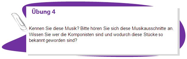 In jedem Bereich stellen wir Ihnen ein paar Beispiele vor. Vielleicht kennen Sie manches schon, vielleicht können Sie in anderen Aspekten Ihr Wissen erweitern. Die Hörbeispiele eignen sich zum Beispiel auch als Gesellschaftsspiel in Ihrer Familie oder mit Ihren Freunden: lassen Sie sie raten, ob sie die Musik erkennen.
